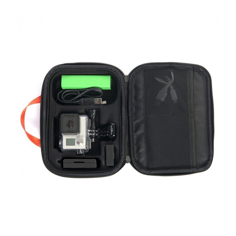 Bolsa rígida para as câmaras GoPro (Hero 4, Hero3+, Hero3, Hero2, Hero), tem zonas interiores moldadas para guardar a câmara, o comando remoto e uma bateria de reserva, assim como um compartimento extra e mais 2 bolsos de rede para outros acessórios.