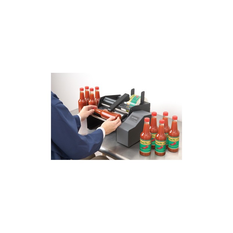 Máquina aplicadora de etiquetas em recipientes cilindricos, como garrafas, frascos, etc. A utilização é extremamente simples, coloca-se o rolo de etiquetas na AP360e, acertam-se as guias, carrega-se com o pé num pequeno botão, e a etiqueta é colada. Tem um braço que aplica pressão e evita a formação de rugas na etiqueta. Permite aplicar até 1200 etiquetas por hora.