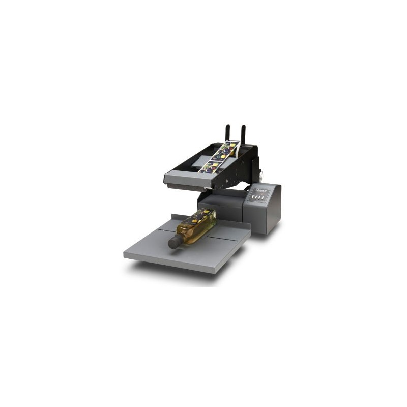 Máquina aplicadora de etiquetas em recipientes planos ou de superficies irregulares. Tem um LED integrado que ajuda a posicionar correctamente os objectos e um contador de etiquetas aplicadas. Permite aplicar até 500 etiquetas por hora.