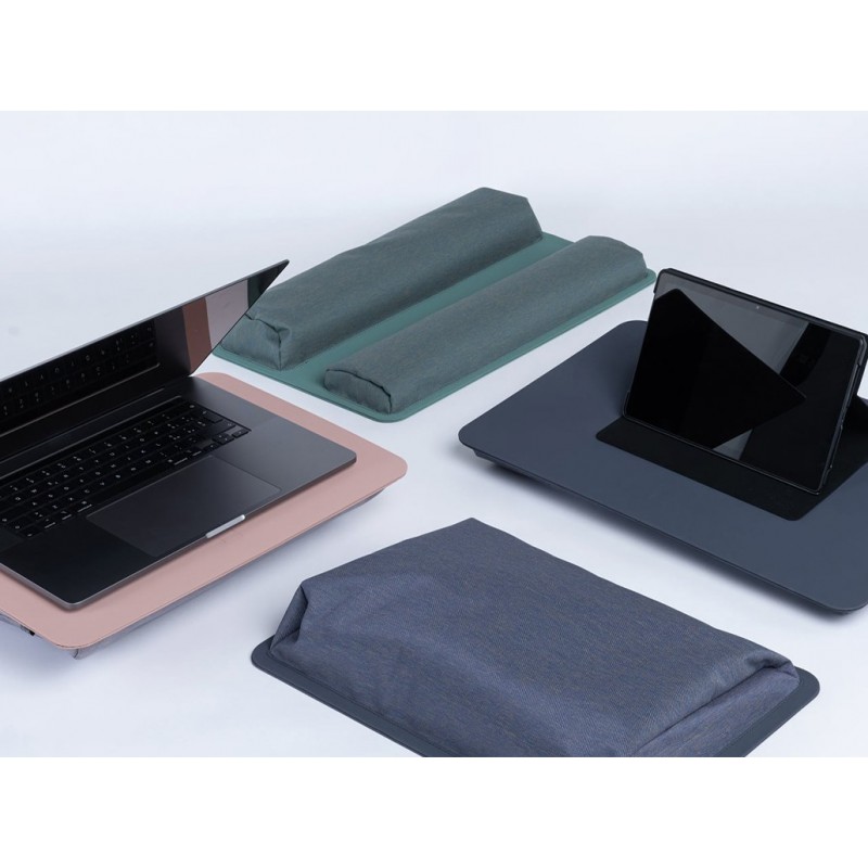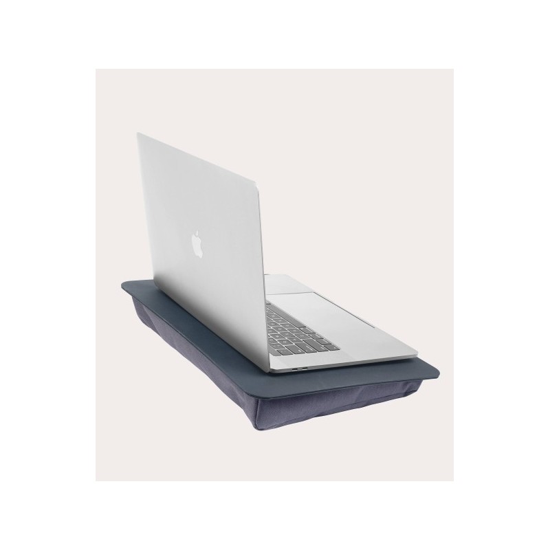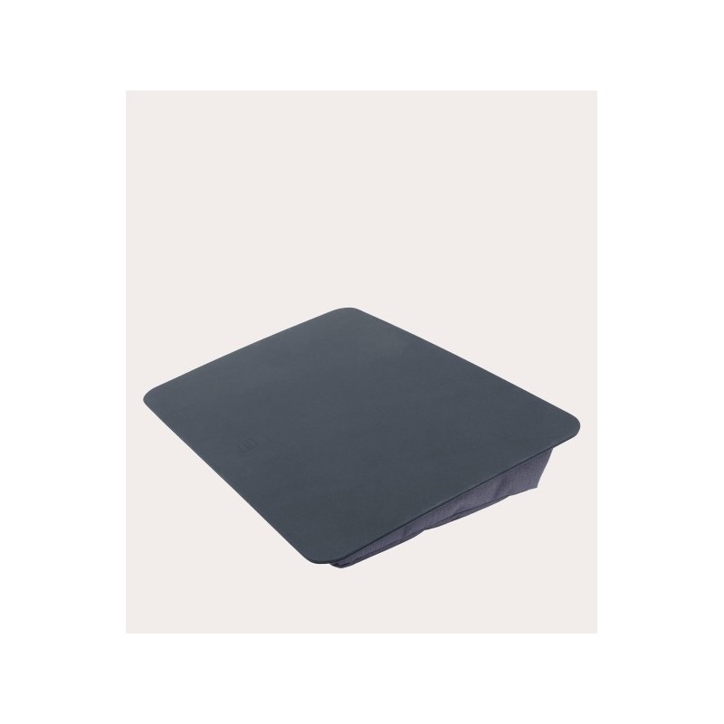 Conjunto de base plana em PU anti derrapante com 1 almofada na base, para pousar um portátil em cima. A almofada proporciona uma ligeira inclinação. Todo o conjunto é extremamente leve e confortável para trabalhar em posições relaxadas, como no sofá, cama, etc. Dimensões exteriores: 43 x 30 x 5.80 cm.