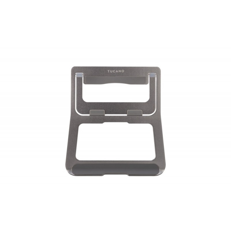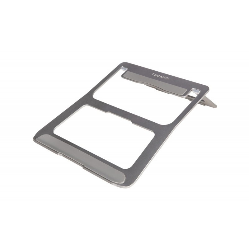 Stand em alumínio que fecha e fica espalmado, para maior portabilidade. Proporciona ao portátil uma inclinação de trabalho mais confortável.