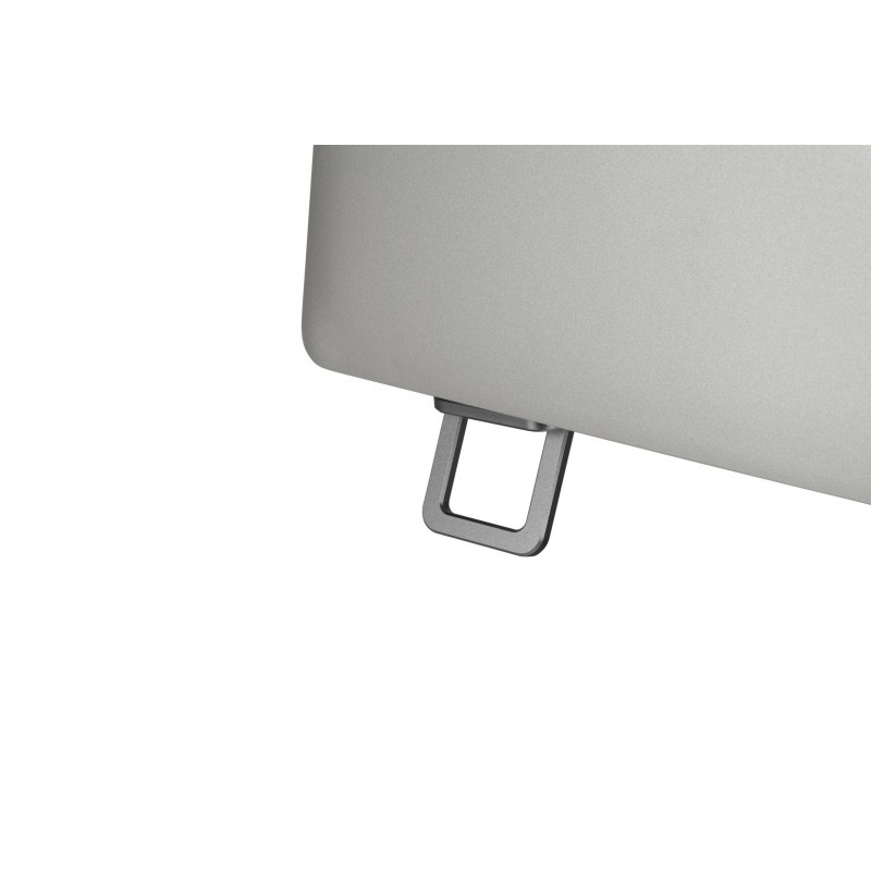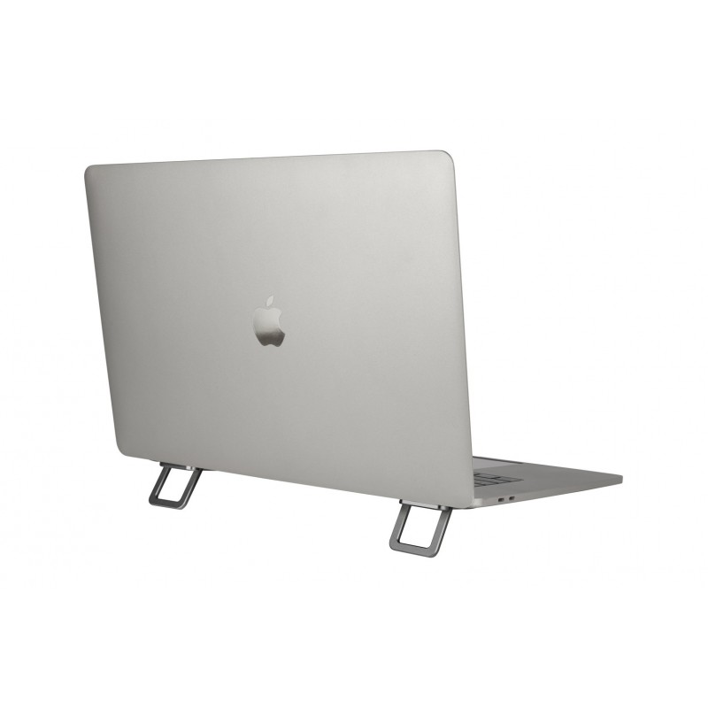 Conjunto de 2 pés em alumínio que aderem por adesivo 3M à base do portátil, e proporcionam uma ligeira inclinação. Fecham e ficam planos, se removidos não deixam resíduo.