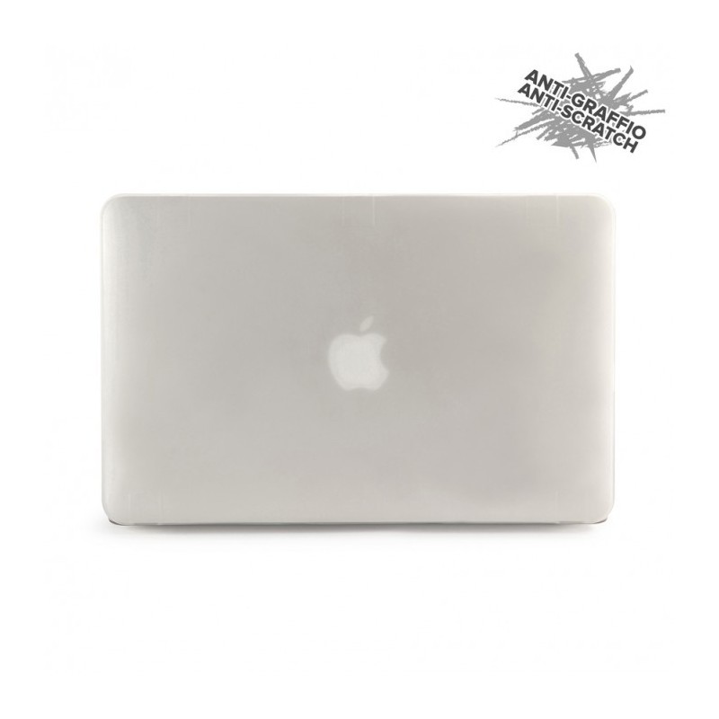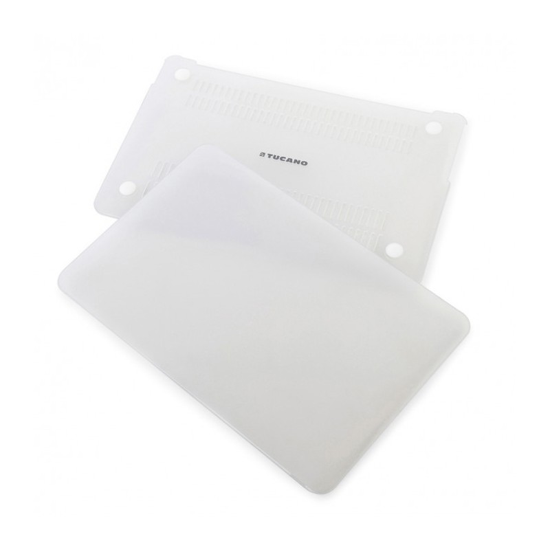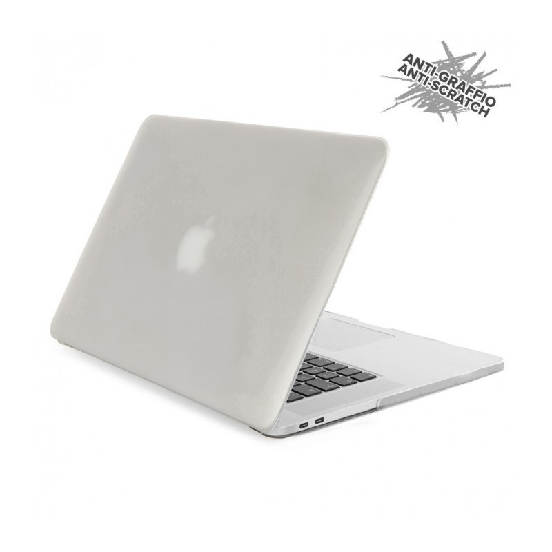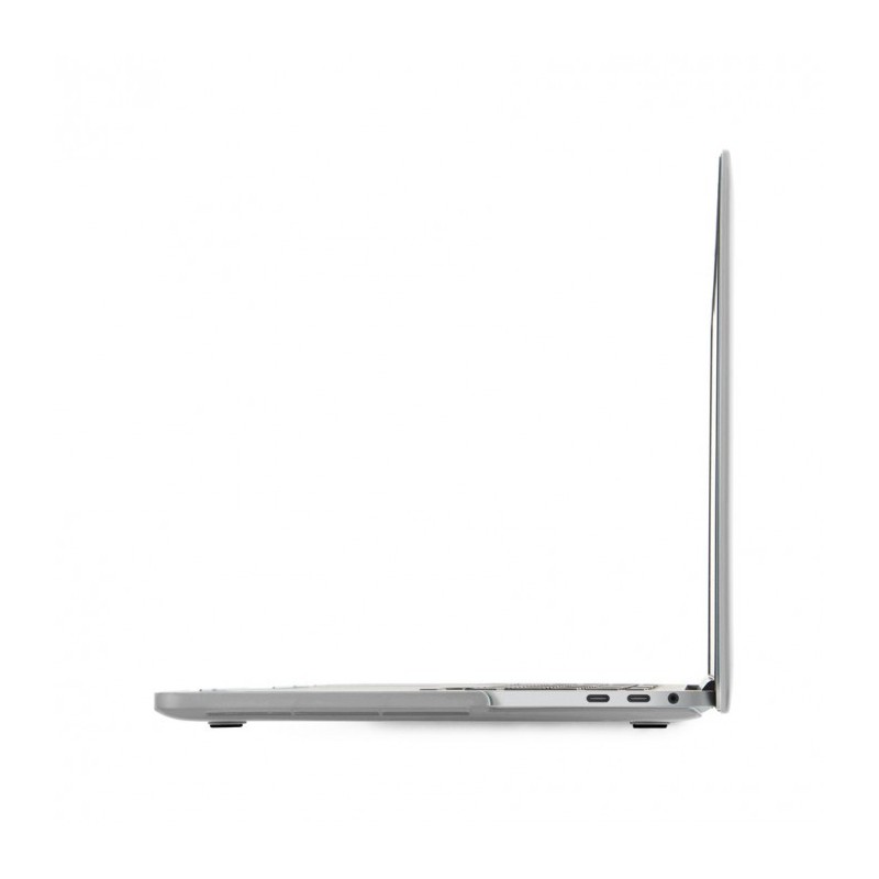 Capa semi-transparente com acabamento aborrachado para protecção do MacBook Pro 13'' v2020. Na parte inferior, tem ranhuras para facilitar a ventilação e pés de borracha.
