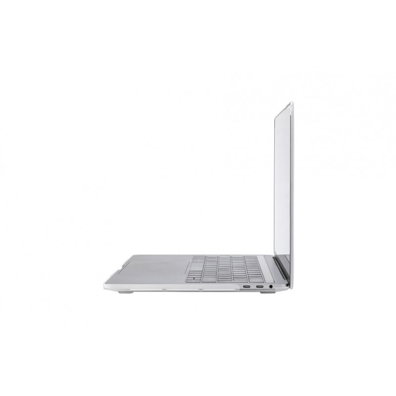 Capa semi-transparente para protecção do MacBook Pro 14 v2021 com acabamento aborrachado em matte. Tem pés de borracha e ranhuras na parte inferior para facilitar a ventilação.