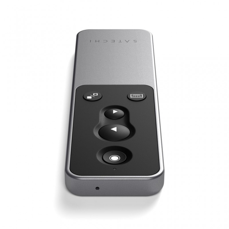 Comando remoto por bluetooth v5, tem bateria interna carregável por USB-C, inclui cabo e apontador laser LED. Suporta PowerPoint, Keynote, PDF, Google Slides, e Prezi. Tem botões para avançar/recuar e ecrã escuro.