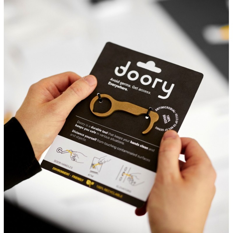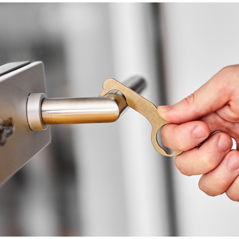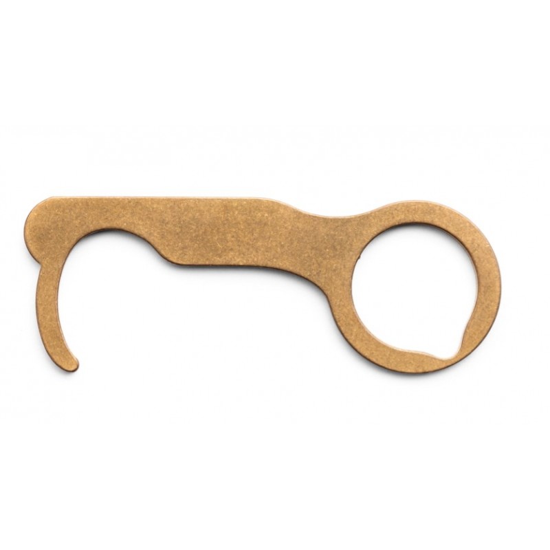 Gancho em cobre que permite manobrar puxadores de portas, tocar em botões de elevador ou terminais de pagamento, e usar como pega de saco, evitando que se toque directamente com as mãos nestes objectos. O cobre tem propriedades anti-microbianas e lava-se facilmente. Pode ser colocado num porta-chaves.