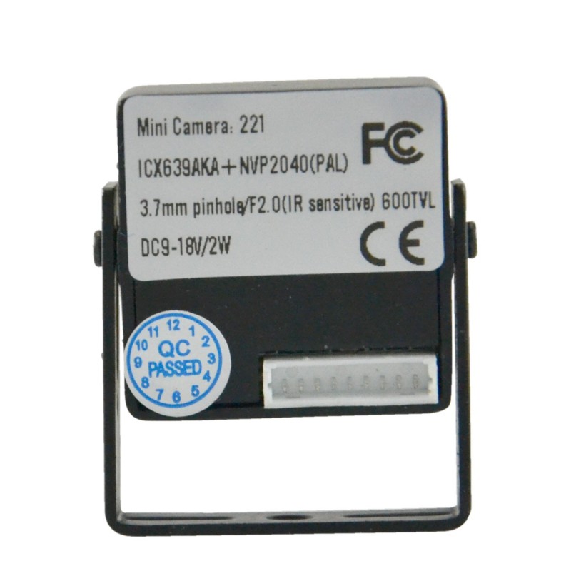 Composta por um sensor 1/3" Sony© 960H Super HAD CCD II (modelo ICX663AKA) e DSP Nextchip© (modelo NVP2040), com uma resolução de 600 linhas. Óptica fixa de 3.7 mm pinhole com um campo de visão diagonal de 79º. Iluminação mínima de 0.3 Lux. Conexão de vídeo por conector BNC