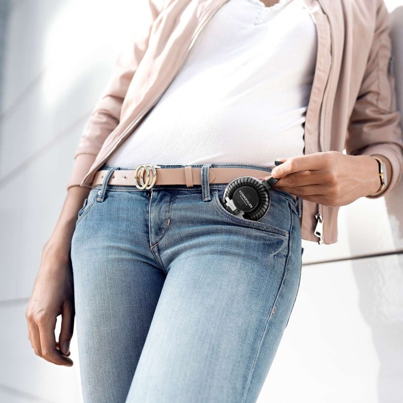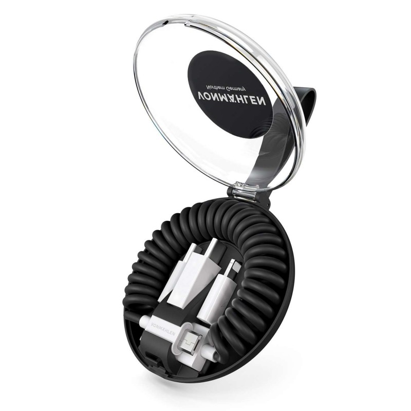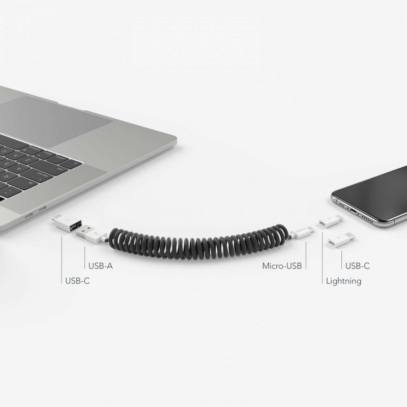 Cabo USB - micro-USB com fio em rolo expansível até 50 cm e caixa de arrumação. Inclui pontas adaptadoras USB-A, Lightning e USB-C, tornando-o extremamente versátil para ligar computadores USB ou USB-C a equipamentos micro-USB, USB-C e Lightning.