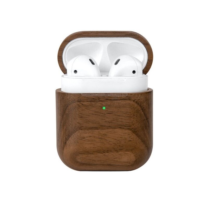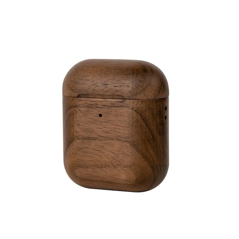 Capa para AirPods em madeira com presilha traseira em cabedal. Tem orifícios para colocar fita de suspensão (não incluída), suporta carregamento Qi.