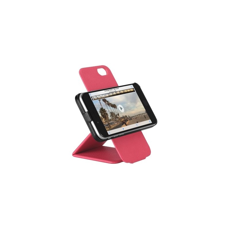 Capa com funcionalidade de stand e um inovador sistema de encaixe que rotaciona na vertical ou horizonal. A pala quando virada para trás na posição de stand adere magneticamente à capa, o fecho frontal também é magnético.