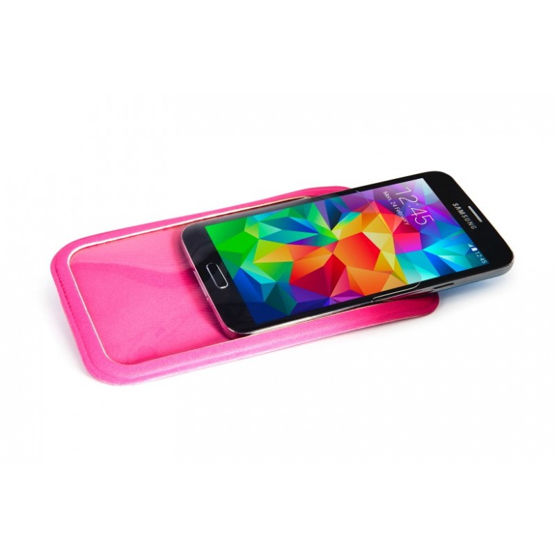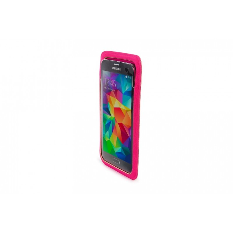 Capa universal para smartphones com traseira em neoprene e parte frontal em plástico transparente compatível com o uso de ecrãs touch screen. Tem uma presilha nas traseiras que permite pendurar a capa num cinto ou arrumar os earphones. Dimensões máximas do telemóvel: 7.3 x 14.2 x 1 cm.