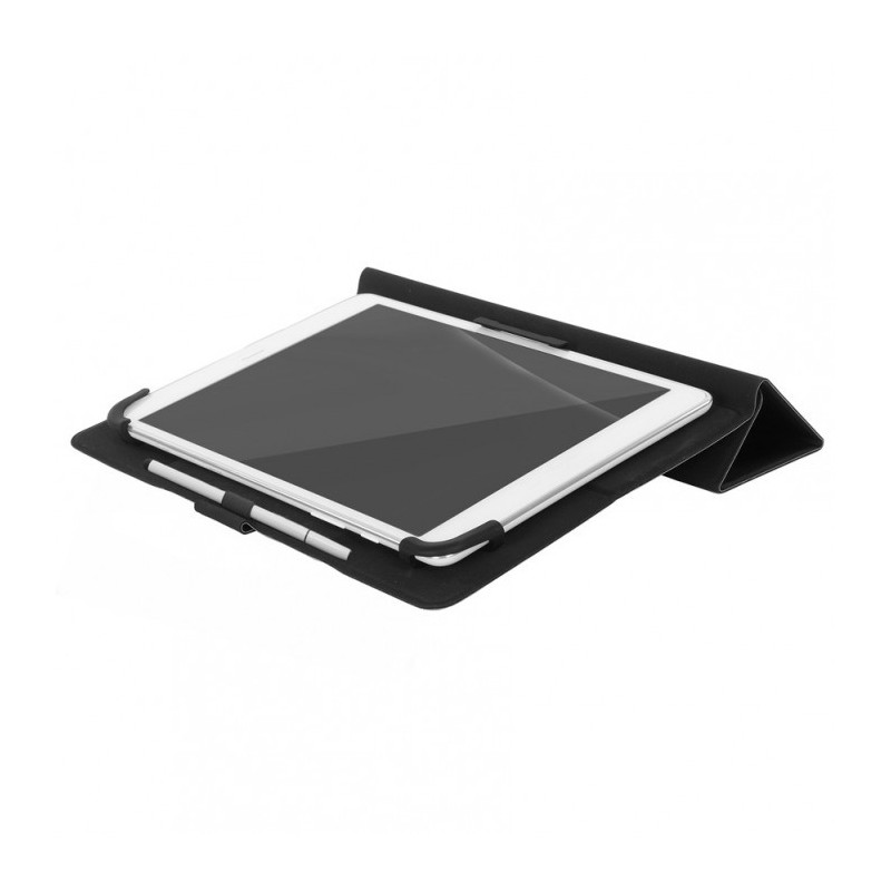 Capa universal tipo agenda para tablet 9/10'', tem um sistema de 3 garras que acomodam tablets de diferentes dimensões. Serve de stand horizontal, tem presilha para caneta, o fecho da capa é magnético.