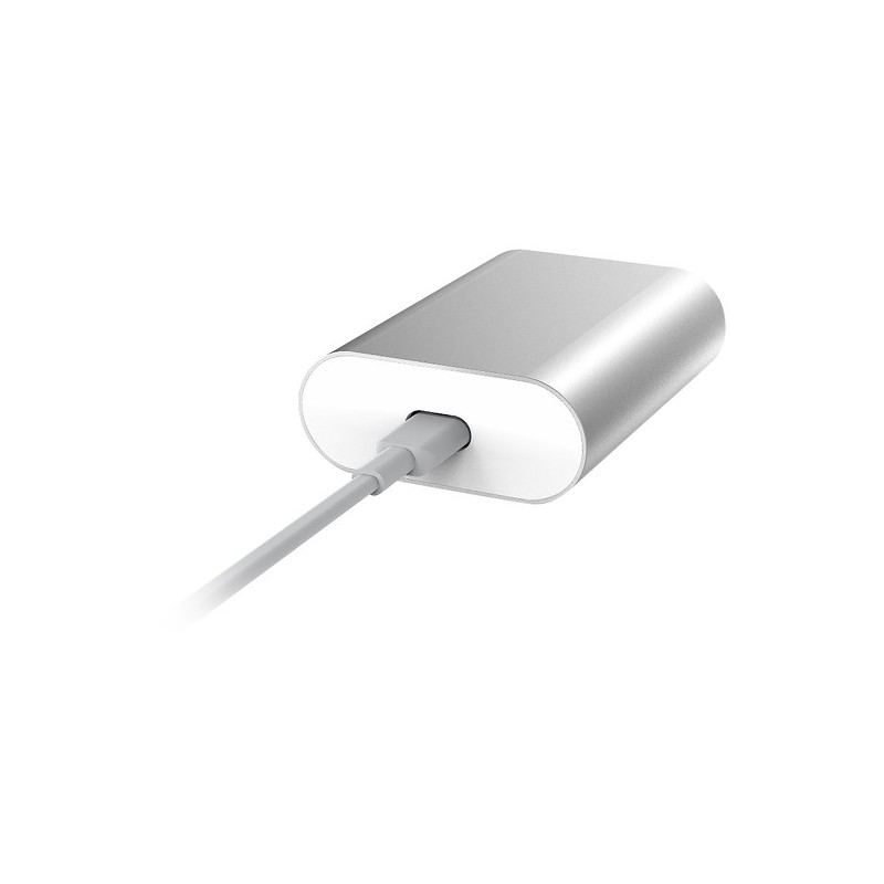 Carregador AC com uma porta USB-C e outra USB (2A). Na porta USB-C carrega MacBooks e outros portáteis equipados com porta USB-C, na USB tablets ou smartphones. Carrega a 5.9 ou 12 Volts dependendo do equipamento (portáteis, discos, smartphones, etc) onde está ligado. O cabo tem comprimento 1.4 metros.