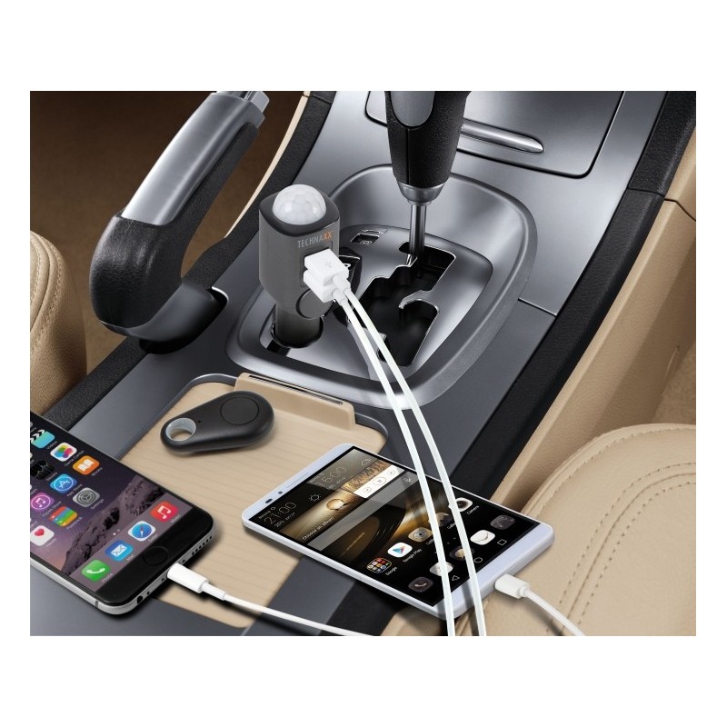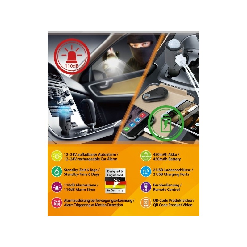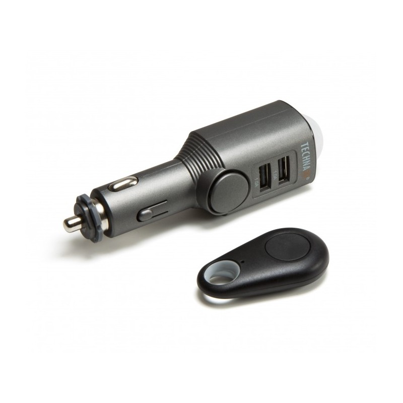 Carregador com 2xUSB 5V/1A para ficha isqueiro do carro, é também um alarme anti roubo. Quando activado pelo comando remoto (incluído), se detectar movimento num ângulo de 120° toca um alarme sonoro 110dB durante 2 minutos.