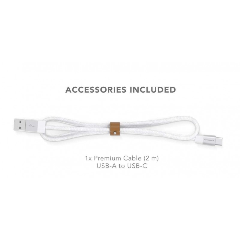Carregador Qi com porta USB-C, inclui cabo USB-C para USB com 2m. Tem superfície revestida a vidro acrílico e bordos em silicone anti-derrapante.
