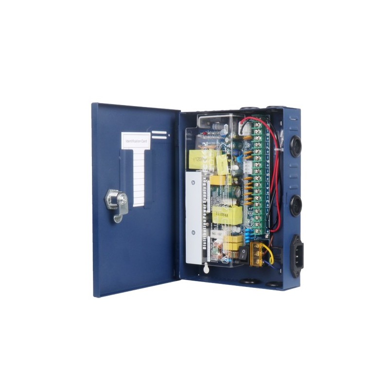 Caixa de distribuição de alimentação profissional. Utiliza-se como fonte de alimentação centralizada para várias câmaras ou outros dispositivos de segurança, oferecendo proteção individualizada.