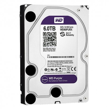 Modelo WD60PURX do fabricante Western Digital. Desenhado e fabricado especialmente para armazenamento em sistemas de videovigilância de até 32 câmaras de alta definição e 8 discos rígidos. Asseguram um perfeito funcionamento de maneira permanente durante as 24 horas, os 7 dias da semana, a altas temperaturas.
