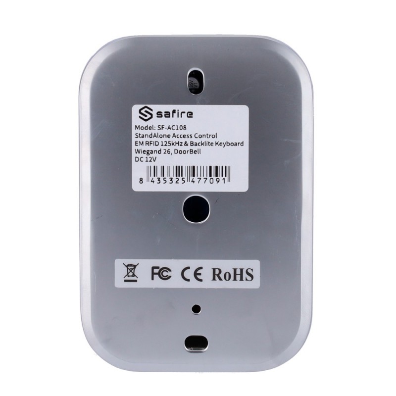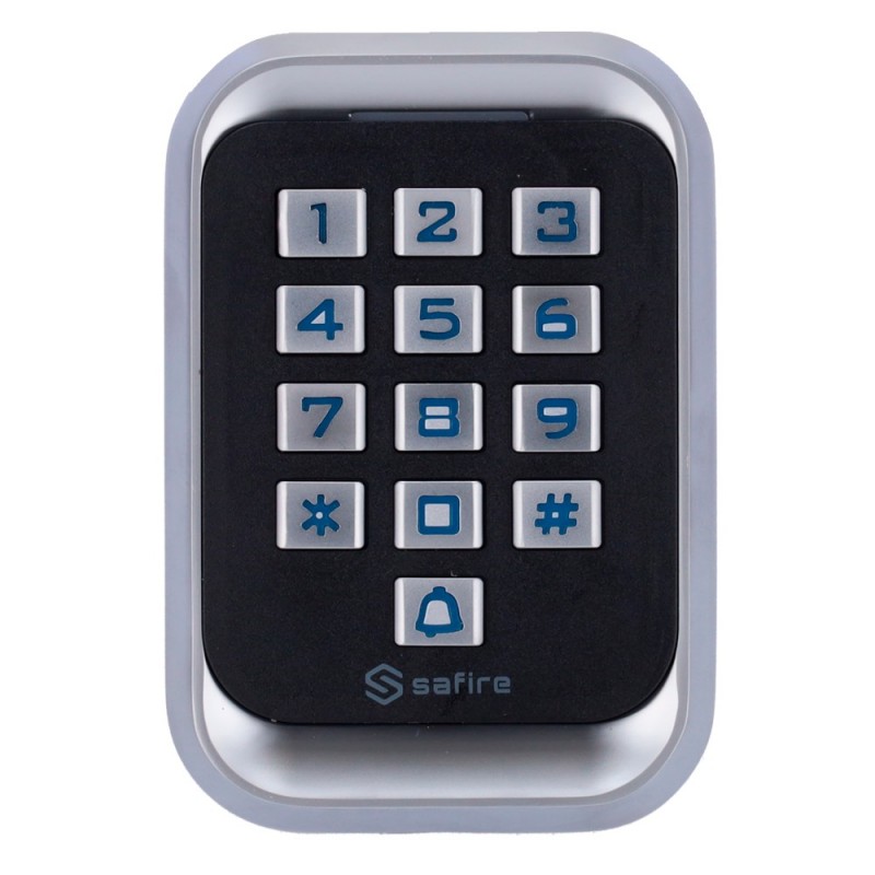 | Saídas | Relé NO/NC, botão pulsador e campainha |