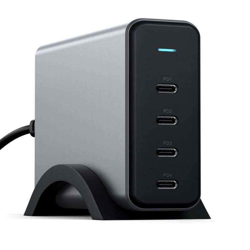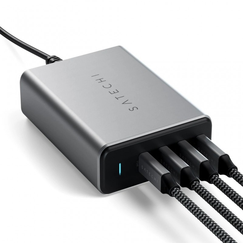 Carregador AC com 4 portas USB-C PD Gan, capaz de carregar 4 equipamentos em simultâneo até um total de 165W, incluíndo iPhone, iPad, e MacBooks e outros. Carrega 1 equipamento até 100W, 2x 60W/30W, 3x 60W/60W/45W ou 100W/30W/30W, e 4x 60W/45W/30W/30W. Requer cabos USB-C certificados para carregamento.