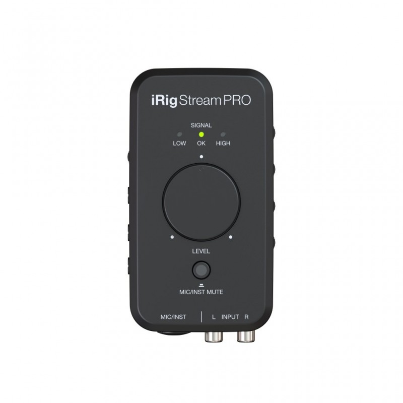 Interface para fazer streaming de audio a 24 bits/96 kHz para iPhone, iPad, Android ou Mac/PC. Tem 2 fichas RCA input, mini-jack 1/8'' para headphones, XLR para microfone, e ligação mini-DIN. Inclui 3 cabos de 60cm com ligação mini-DIN para ligtning, USB-C e USB, e 2x pilhas AA. Pode ser ligado ao carregador iRig PSU, não incluído.