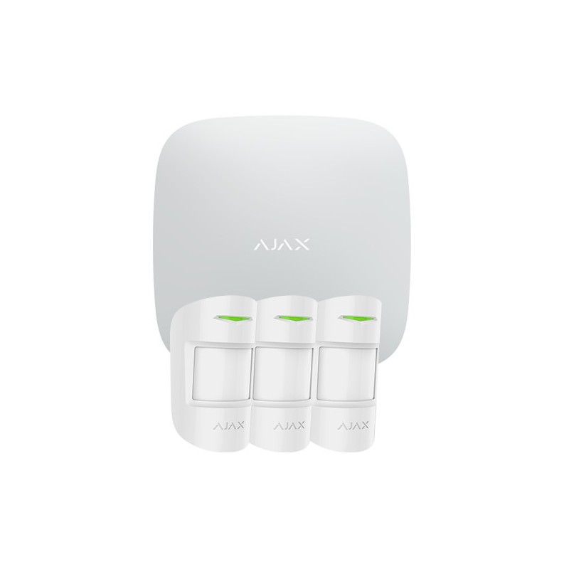 O kit inclui o painel de controlo Ajax Hub AJ-HUB-W e 3 detectores de movimento AJ-MOTIONPROTECT-W.
