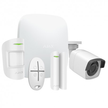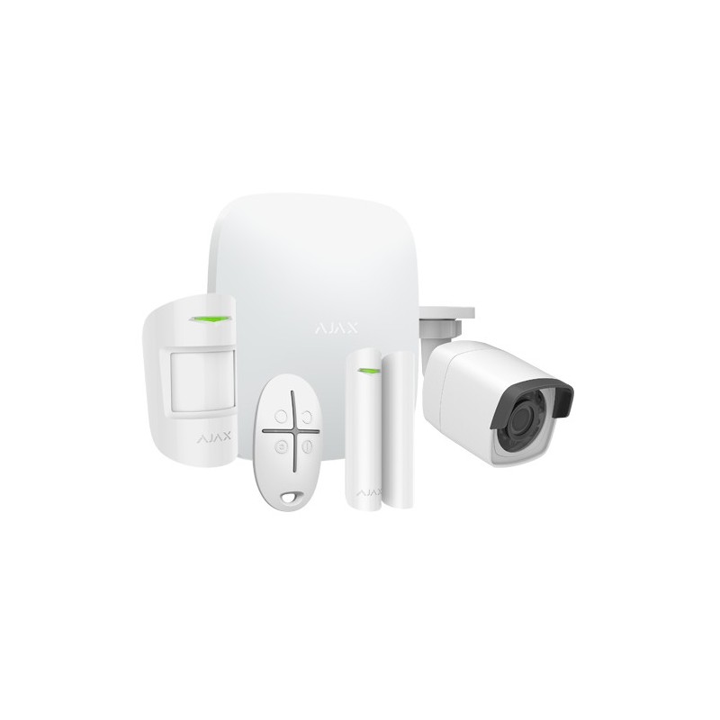 O kit inclui o painel de controlo Ajax Hub, 1 contacto magnético AJ-DOORPROTECT-W, um detector de movimento AJ-MOTIONPROTECT-W, um comando a distancia AJ-SPACECONTROL-W e a câmara IP WiFi SAFIRE SF-IPCV220-2WI.