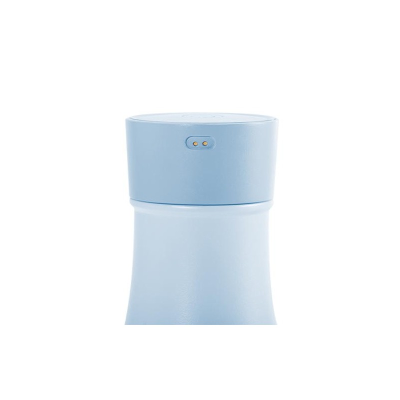 Garrafa termo inteligente em aço, tem uma luz UV-C que ao acender durante 5 minutos mata 99.9% das batérias e vírus. Mantém as bebidas quentes durante 12 hr, ou frias durante 24 hr. Tem uma bateria interna recarregável por porta USB, através de um cabo que adere magneticamente à garrafa, com autonomia para 1 mês de funcionamento com 1 esterilização diária. Se der 1 toque na tampa, a luz indica o nível da temperatura, com 2 toques esteriliza, se não tocar durante 2 horas pisca como alerta para ingerir líquidos.