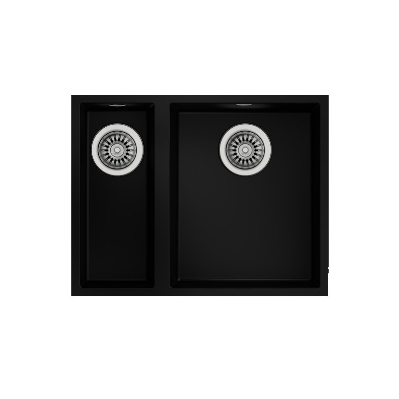 Sob TampoLava-louças de duas baciaTegranito de alta resistênciaNão rugoso e fácil de limparProfundidade das bacias: 200 e 155 mmMóveis de 60 cmMedidas gerais (lxp) 560x440mmCor: Preto