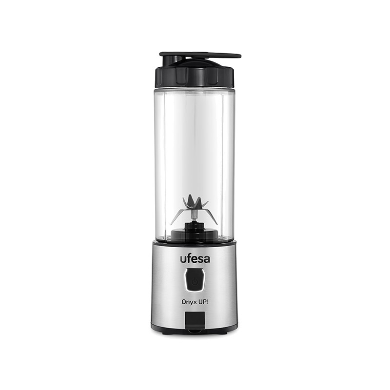 400 ml de vidro tritan (sem BPA) 2 baterias de 2550 mAh 16500 rpm/min 6 lâminas de aço inoxidável Paragem automática após 45 segundos Sistema de bloqueio de segurança Até 20 utilizações por carga Corpo em aço inoxidável Carregamento USB Tampa desportiva