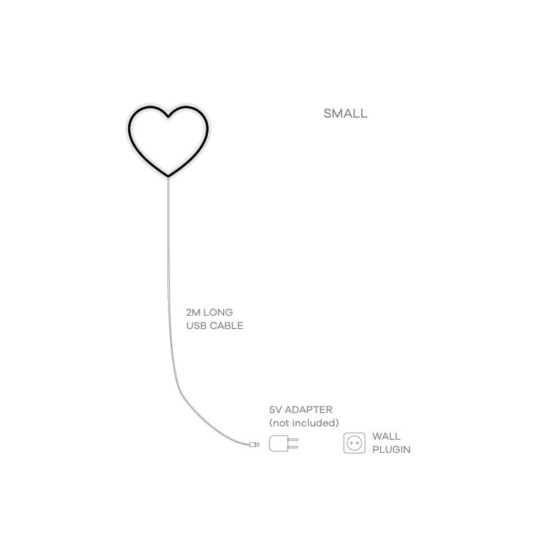 Fita de luz LED flexível, com base em acrílico transparente e tubo em silicone de cor semi-transparente. Serve como luz e elemento decorativo extremamente apelativo e original. Inclui parafusos para fixar na parede, cabo USB 2m, requer um carregador AC 5V. Tem dimensão máxima 40x40cm e 2cm espessura. O LED tem tempo de vida 30.000 hrs (2-3 anos 24/7).