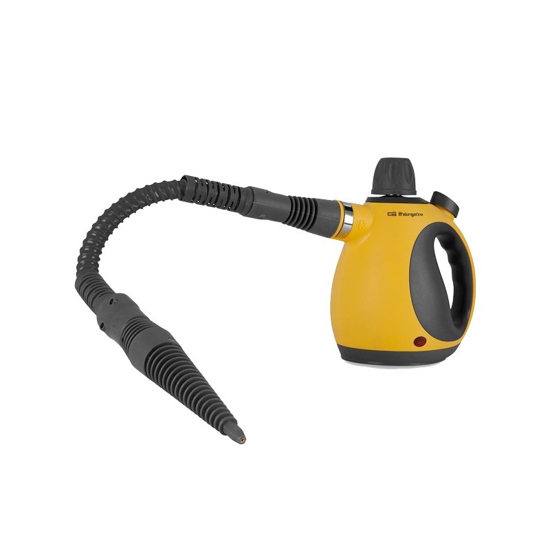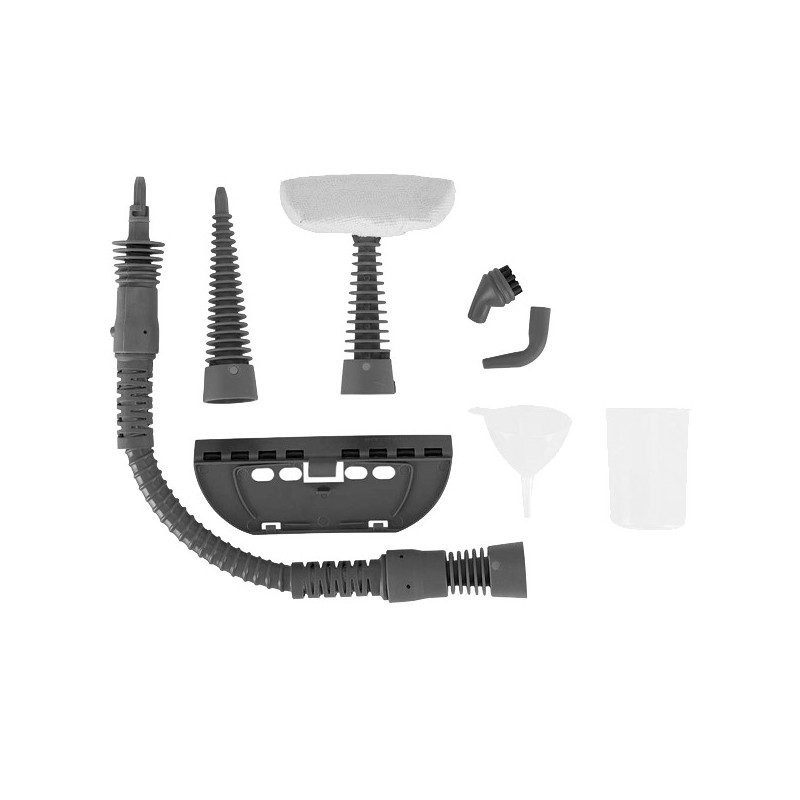 9 acessórios: Tubo flexível, bico cônico, acessório para superfícies lisas, acessório para vidro, pano, escova redonda, bico inclinado, funil e copo medidor.