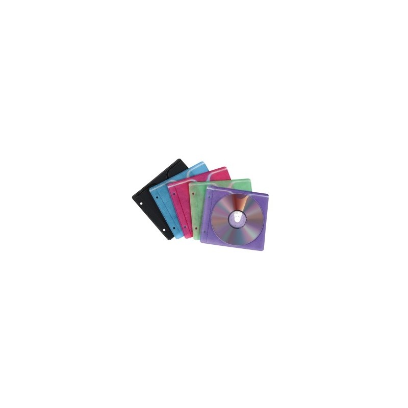 Conjunto de 25 capas coloridas individuais para CD/DVDs em Polietileno translucido, revestido interiomente a papel alcochoado, já furadas para arquivar em pastas ou para transportar. Inclui 5 unidades cada das seguintes cores: azul, roxo, cor de rosa, preto, e verde.