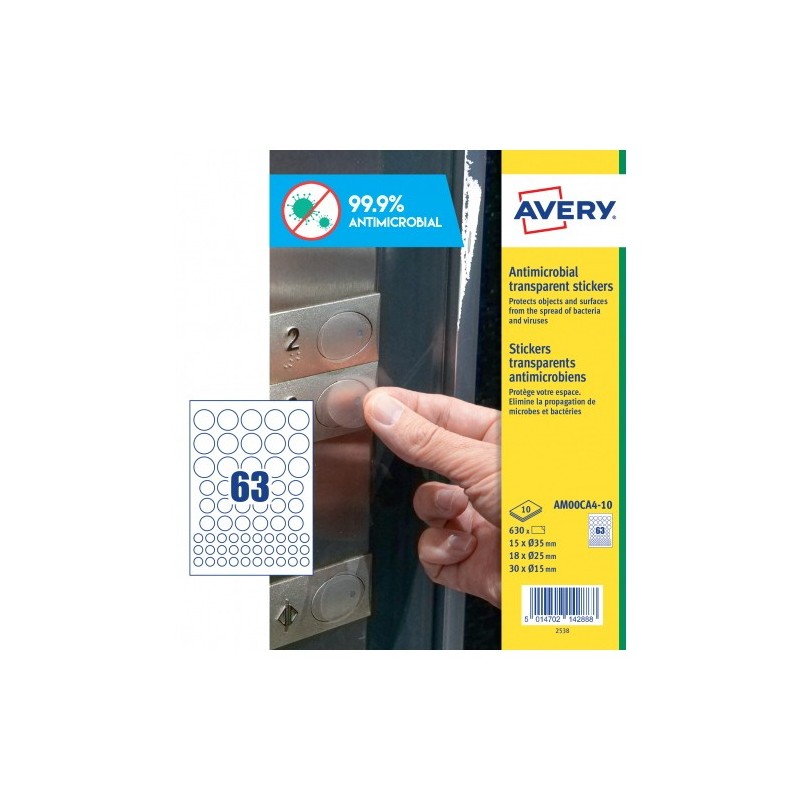 Etiquetas transparentes e removíveis com um revestimento antimicrobiano. Ao reduzir drasticamente as condições que os micróbios necessitam para sobreviver e se multiplicar, são 99.9% eficazes contra batérias, vírus e fungos. O ingrediente activo do revestimento está aprovado pela FDA, EPA e EFSA. Cada caixa inclui 10 folhas, 63 etiquetas circulares/folha (15x 3.5mm, 18x 2.5mm, 20x 1.5mm).