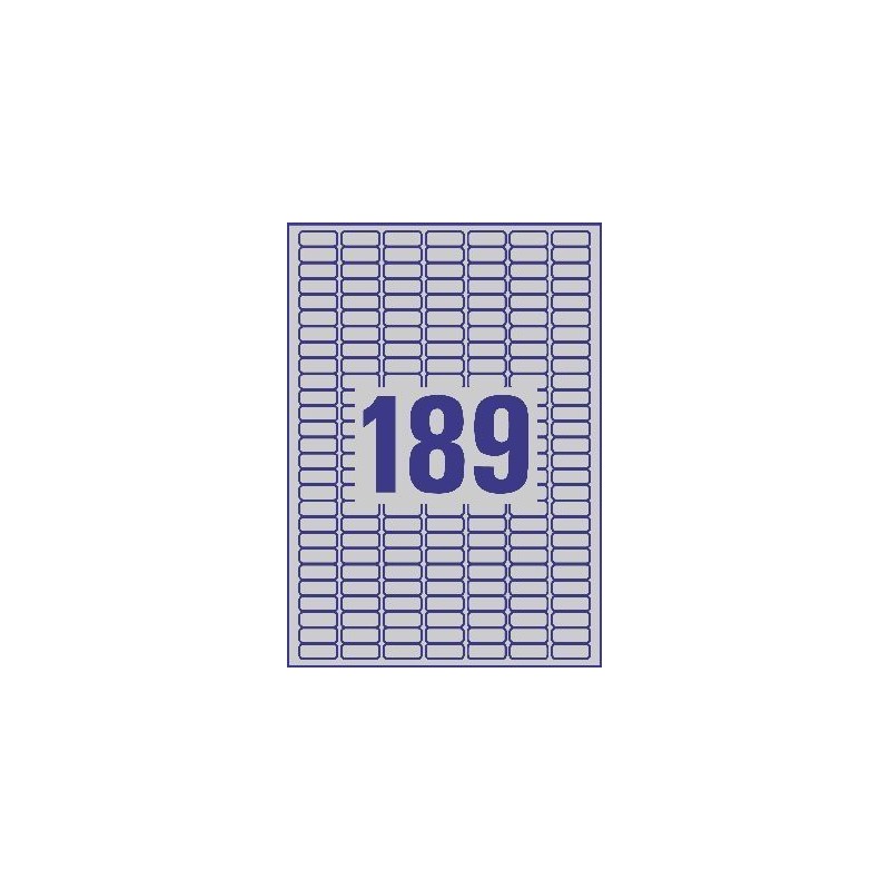 Etiquetas em poliester ultra resistente de cor cinza metálico, com adesivo especial para aderir a superfícies hostis. Suportam humidade, baixas e altas temperaturas, gorduras, etc. Dimensões 25.4 x 10 mm, 189 etiquetas por folha, 20 folhas (tamanho A4) por caixa.