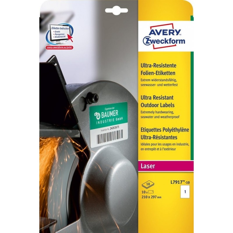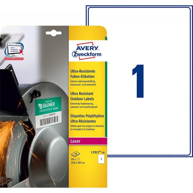 Etiquetas em polietileno ultra-resistente para impressão em laser ou inkjet. Ideal para superfícies curvas ou rugosas. Resiste a temperaturas entre -40ºC e +150ºC, solventes, gordura e UV. 1 etiqueta/folha, 10 folhas. Dimensões etiquetas: 210 x 297 mm.