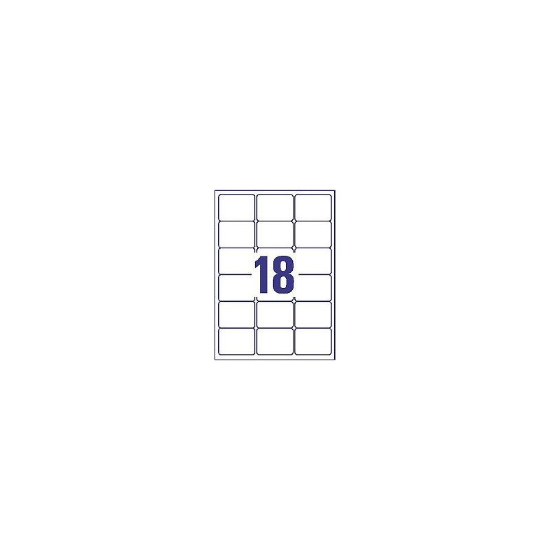 18 etiquetas/folha, 100 folhas. Dimensões de cada etiqueta: 63.5 x 46.6 mm.