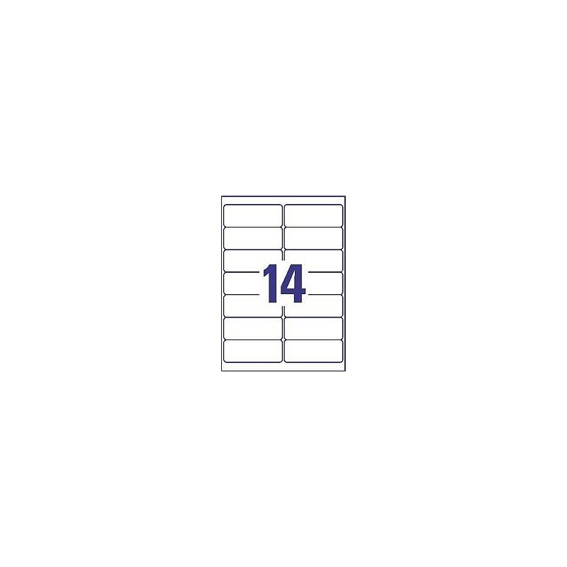 14 Etiquetas/folha, 100 folhas. Dimensões de cada etiqueta: 99.1 x 38.1 mm.