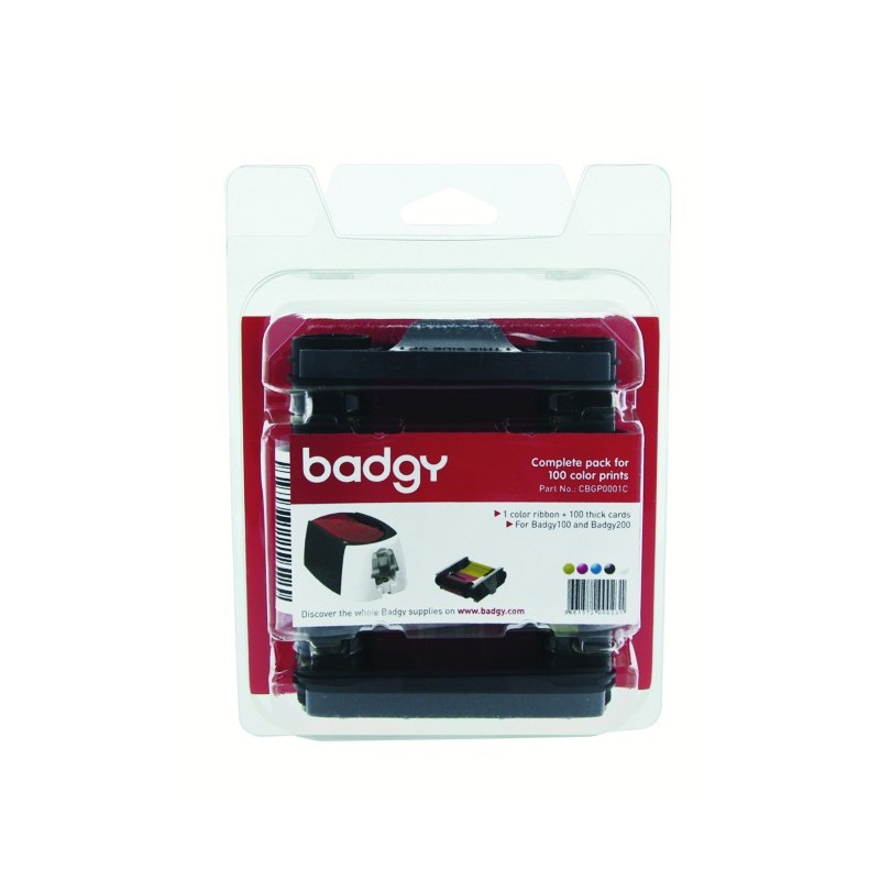 Inclui 1 fita YMCKO (4 cores+vernis) com capacidade para 100 impressões, e 100 cartões de 0.76mm. É compatível com a Badgy100 e Badgy200.