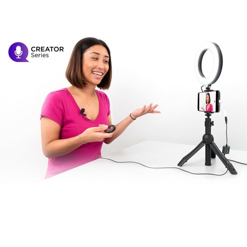 Bundle composto pelo microfone iRig Mic Lav, bastão/tripé iKlip Grip Pro e pelo anel de luz LED 6.