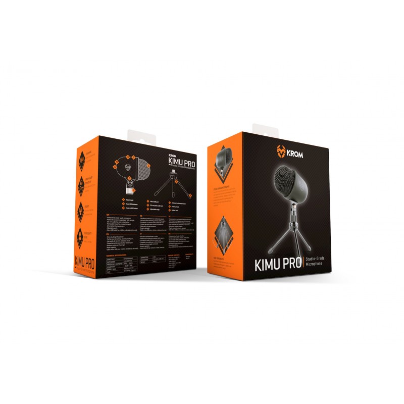 Krom Kimu Pro. Tipo: Microfone para PC, Sensibilidade do microfone: 3 dB, Frequência do microfone: 20 - 20000 Hz. Tecnologia de conetividade: Com fios, Interface de dispositivo: USB. Cor do produto: Preto, Sistemas operativos compatíveis: Windows / Linux. Fonte de alimentação: USB. Peso do microfone: 220 g, Dimensões (C x L x A) com suporte: 74 x 115 x 190 mm