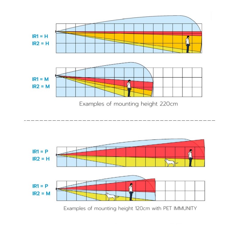 | Configuração no detetor (LEDs e botões) | Sensibilidade / Anti-masking / Tamper anti sabotagem/ Altura de montagem / Imunidade dos animais / Intervalo de deteção (mais informação pág. 9 manual na secção de download) |