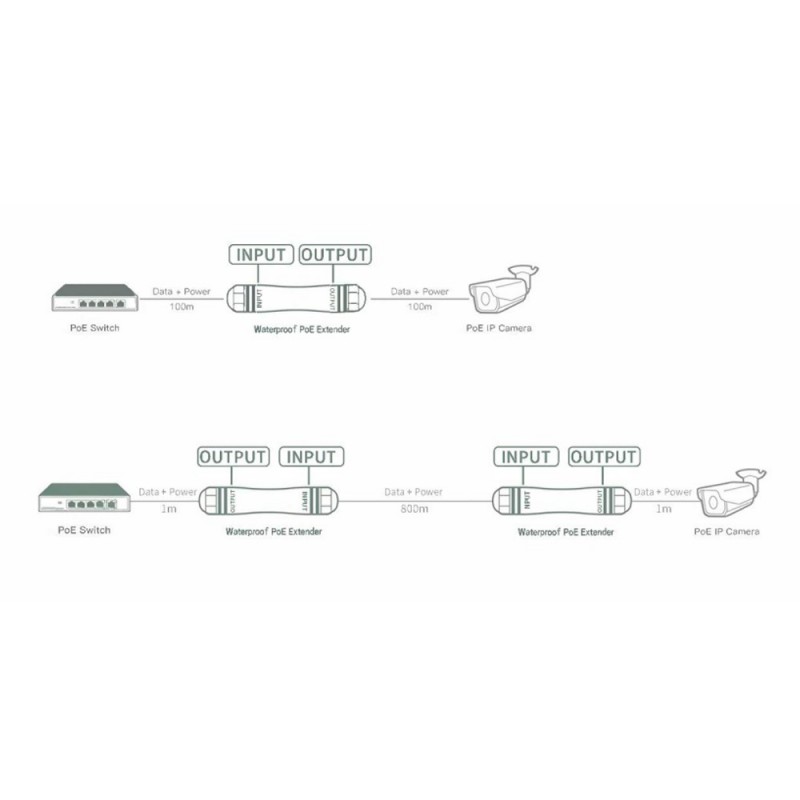 | Alcance | - Se for utilizado um POE-EXT01-800M-IP67 ligado a um switch PoE+ normal, a distância de transmissão será aumentada em 100 metros a uma velocidade de 100Mbps.. - A utilização de um POE-EXT01-800M-IP67 ligado a um interrutor PoE+ de 800 metros (SW1008POE-H-800M-120W ou SW0604POE-800M-60W), aumentará a distância de transmissão até 300 metros a 100Mbps ou mesmo 800 metros a 10Mbps.. - Utilizando dois POE-EXT01-800M-IP67 ligados entre si, podem ser alcançadas distâncias até 300 metros a 100Mbps ou mesmo 800 metros a 10Mbps.. |