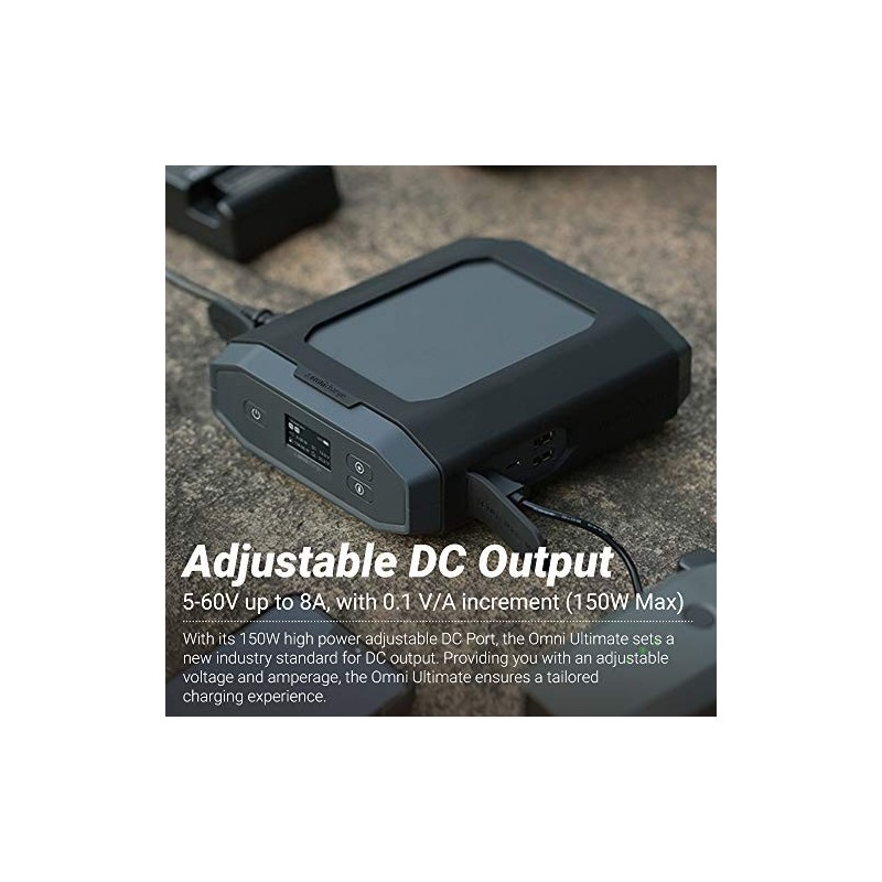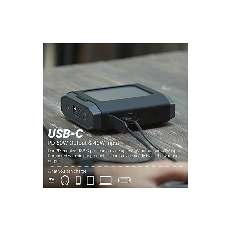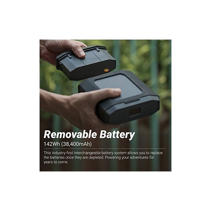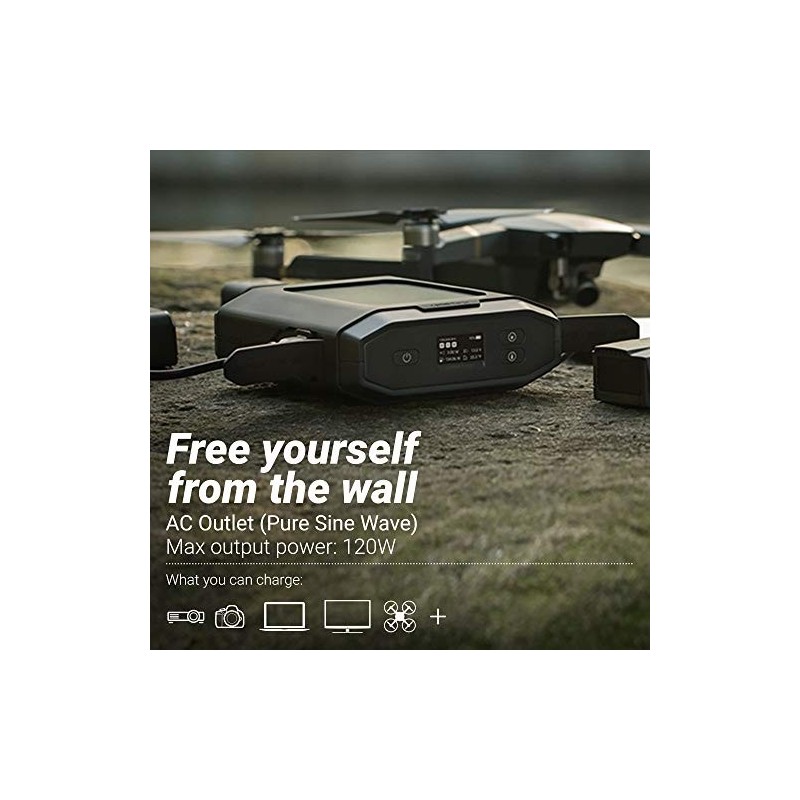 Powerbank de 38400 mAh com output AC, DC e USB-C. Carrega qualquer tipo de equipamento atrav?s de porta AC 120W, USB-C 100W (ou 2x 45W), DC 100W ou USB (2x). A bateria interna ? remov?vel, pode ter v?rias de reserva e trocar. Tem painel informativo de status de carga.