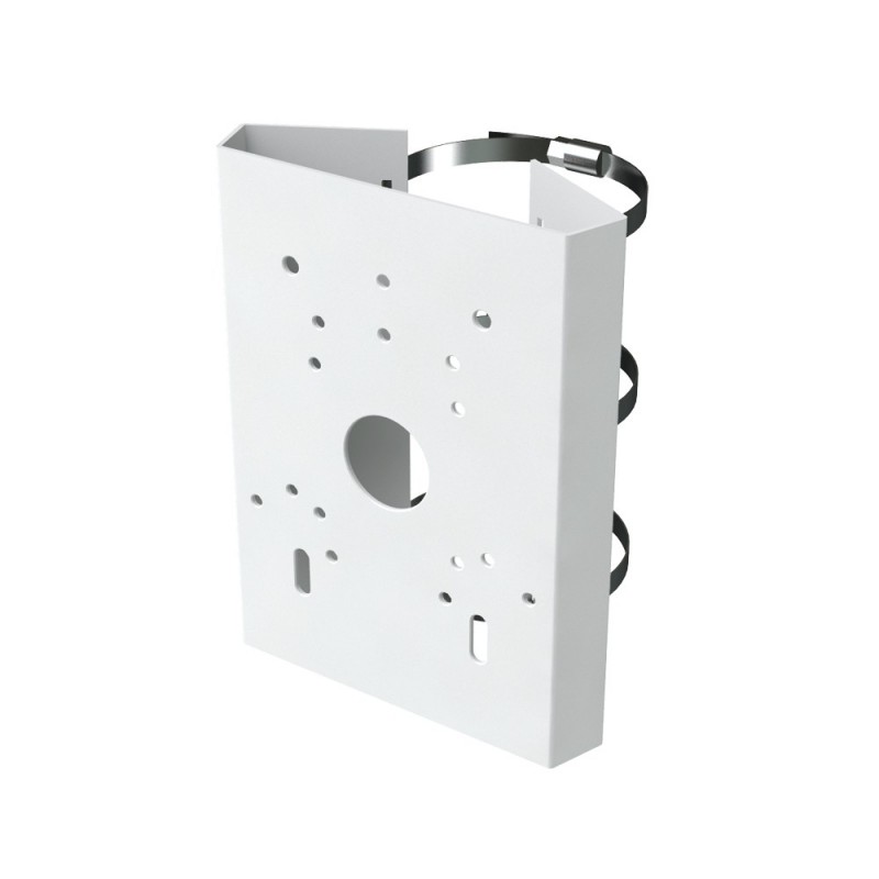 Compatível com as câmaras (Ver compatibilidade de acessórios). Fixado ao suporte de parede da câmara através de 4 parafusos incluídos. Fixado ao mastro ou poste através de 3 flanges metálicas, altamente resistentes com um intervalo de diâmetro útil de 103 ~ 127 mm. Pode ser instalada em qualquer superfície cilíndrica que se encontre nesta faixa.