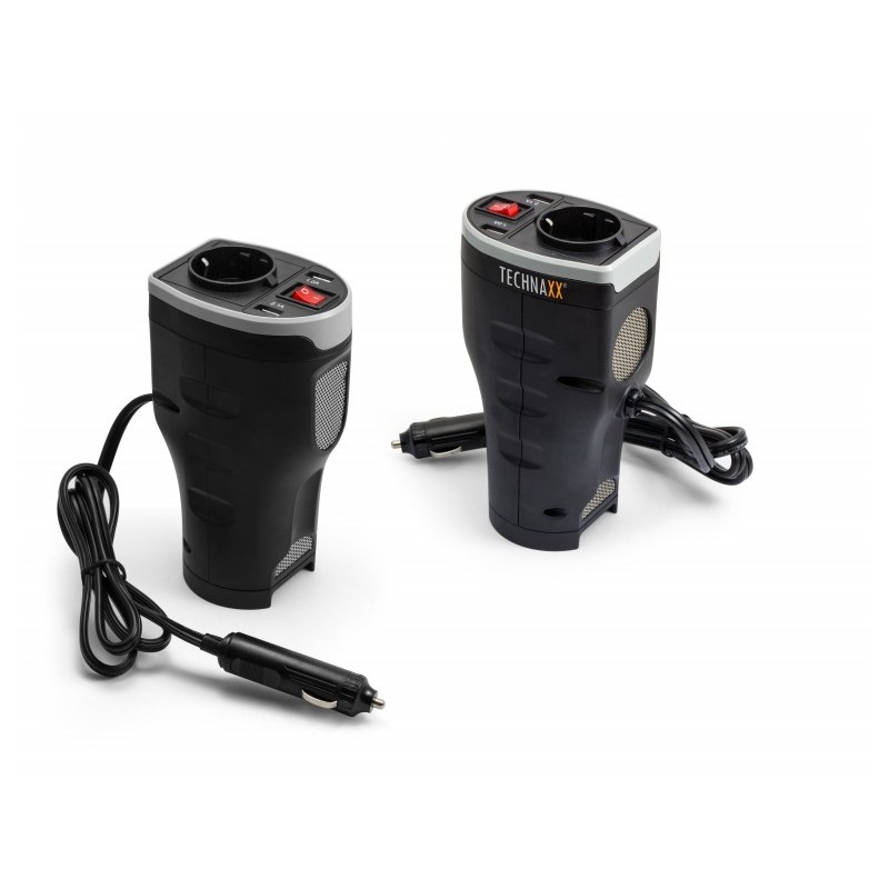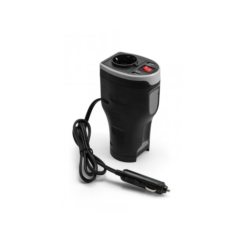 Carregador que liga na ficha isqueiro do carro, e tem uma ficha el?ctrica AC normal 230V/50Hz, capaz de carregar port?teis e outros equipamentos at? 200W, e 2 fichas USB. Tem fus?vel, grelha de ventila??o para evitar aquecimento, encaixa no suporte de garrafas do carro.