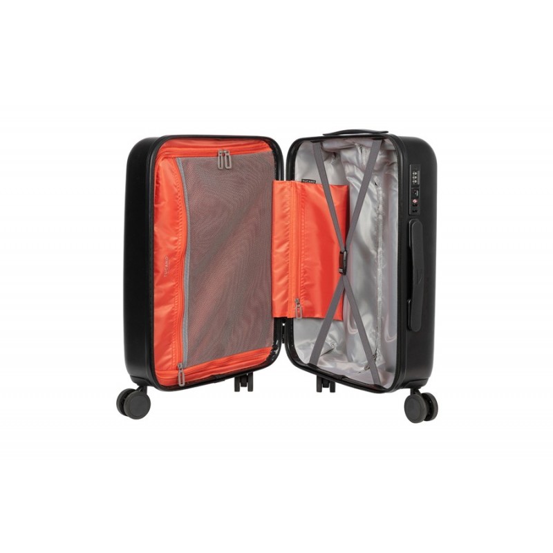 Trolley de viagem em policarbonato, com 4 rodas, pegas na horizontal e vertical, e zip duplo. No interior numa das faces tem um separador em tecido com zip, e na outra fitas el?sticas cruzadas. O fecho de seguran?a ? de combina??o de 3 d?gitos e TSA compat?vel. Dimens?es 39 x 55 x 21 cm.
