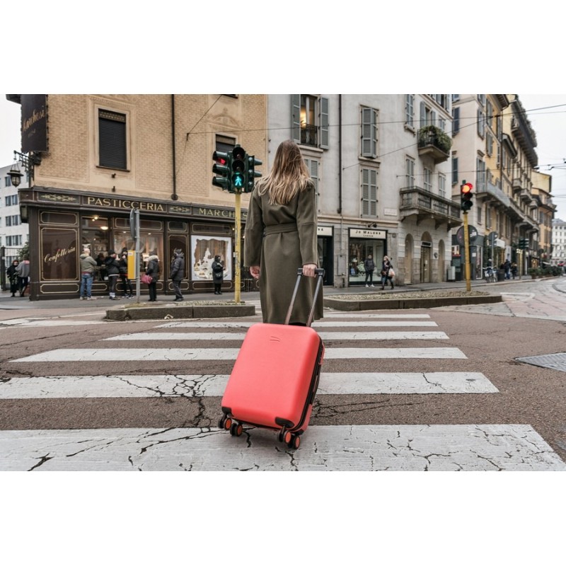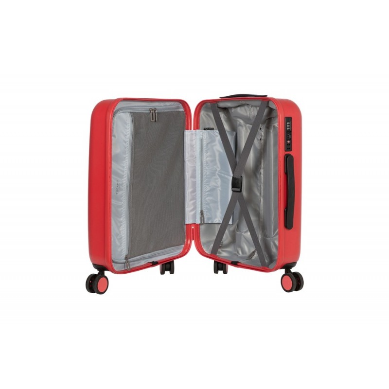 Trolley de viagem em policarbonato, com 4 rodas, pegas na horizontal e vertical, e zip duplo. No interior numa das faces tem um separador em tecido com zip, e na outra fitas el?sticas cruzadas. O fecho de seguran?a ? de combina??o de 3 d?gitos e TSA compat?vel. Dimens?es 39 x 55 x 21 cm.