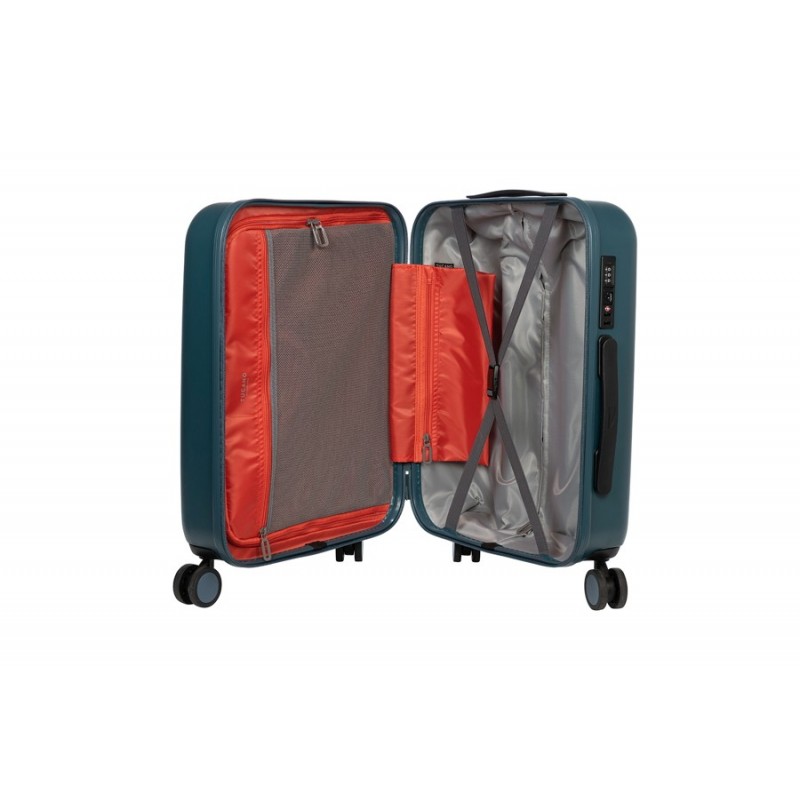 Trolley de viagem em policarbonato, com 4 rodas, pegas na horizontal e vertical, e zip duplo. No interior numa das faces tem um separador em tecido com zip, e na outra fitas el?sticas cruzadas. O fecho de seguran?a ? de combina??o de 3 d?gitos e TSA compat?vel. Dimens?es 39 x 55 x 21 cm.