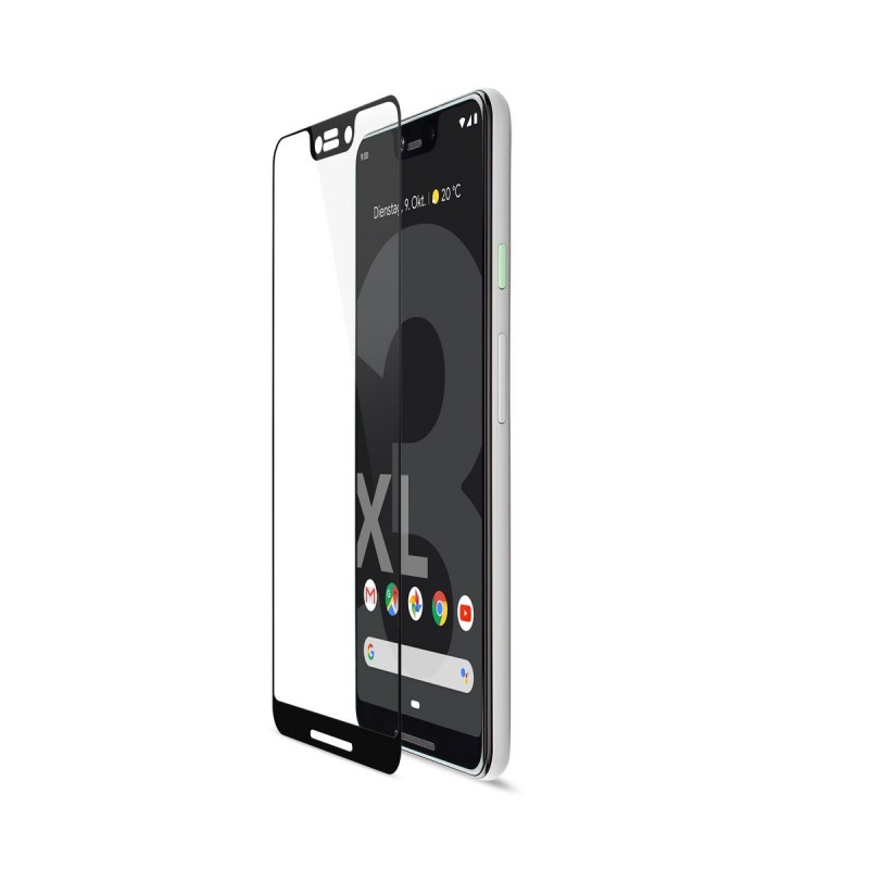 Película de protecção em vidro para o Google Pixel 3XL, com arestas arredondadas e bordos de cor, cobre o ecrã até às extremidades dos bordos.