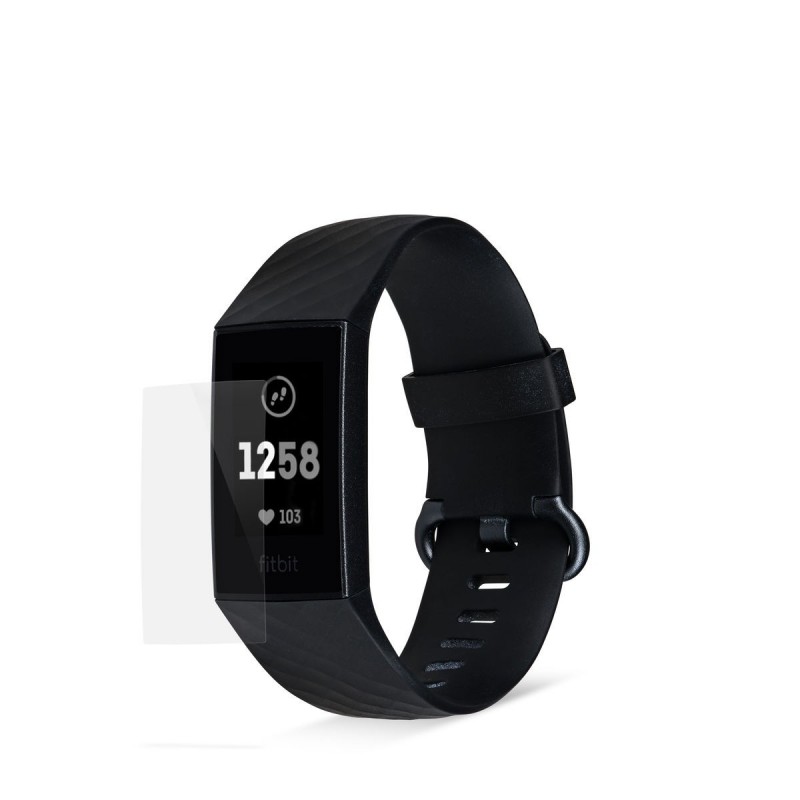 Conjunto de 2 películas de plástico para protecção do ecrã do Fitbit Charge 3. Inclui um pano de limpeza em microfibra, tem resistência à água.